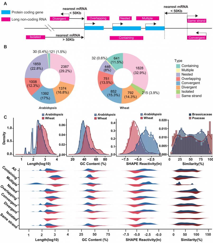 对拟南芥和小麦中的lncRNA进行了系统的分类和特征分析。研究发现,尽管两类植物的lncRNA在类型分布上相似(都以“同链型(same-strand)”为主)(图1B),但在转录本长度、GC含量和体内RNA结构稳定性上存在显著物种差异(图1C)。此外,lncRNA序列在各自的进化支系(十字花科和禾本科)内部表现出中等程度的保守性(图1C)。
