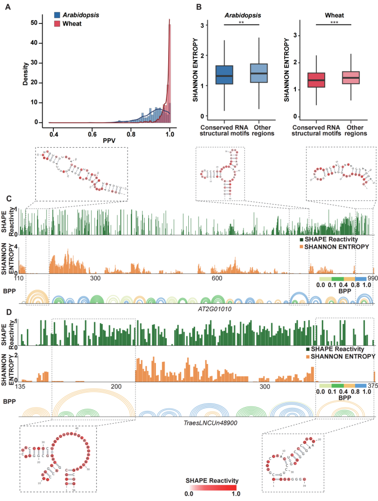 随后,探究了lncRNA中保守的RNA二级结构基序。研究发现,在拟南芥和小麦中分别有33%和60%的lncRNA含有至少一个保守的RNA结构基序,同时拟南芥和小麦中大多数保守基序很可能在体内折叠(图2A),保守的RNA二级结构基序倾向于稳定折叠(图2B)。拟南芥lncRNA AT2G01010和小麦lncRNA TraesLNCUn48900就是这种趋势的例证(图2C, D)。这些基序在体内能够稳定折叠,并且其结构确定性远高于lncRNA的其他区域,表明RNA结构在进化中可能受到功能性的选择。